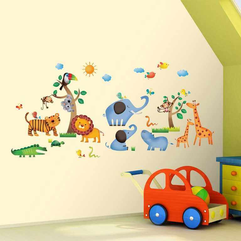 Das Wandtattoo Zoo mit den wilden Tieren aus dem Dschungel ist ein ideales Wandtattoo für dein Kinderzimmer oder Babyzimmer. Das Wandtattoo besteht aus 4 Blättern mit einer Breite von 50cm und Höhe von 25cm. Das Motiv besteht aus süßen 2 blauen Elefanten, 1 grünes Krokodil, 2 Giraffen, 1 blaues Nilpferd, 2 Schlangen, 1 kleine Schildkröte, 1 Löwe, 1 gestreifter Tiger, 2 Affen, 2 Pandas, 1 Papagei und einigen kleinen Vögeln. Das Wandtattoo die bunte und wilde Tierwelt des Dschungels lässt sich sehr einfach abringen.